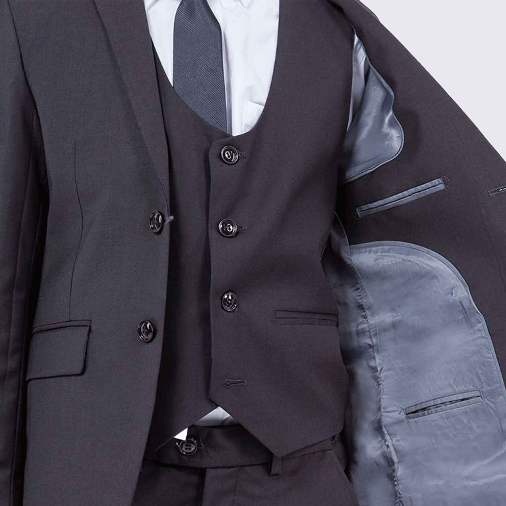 - Set Includes: Jacket, pants, vest, dress shirt, and pre-tied necktie