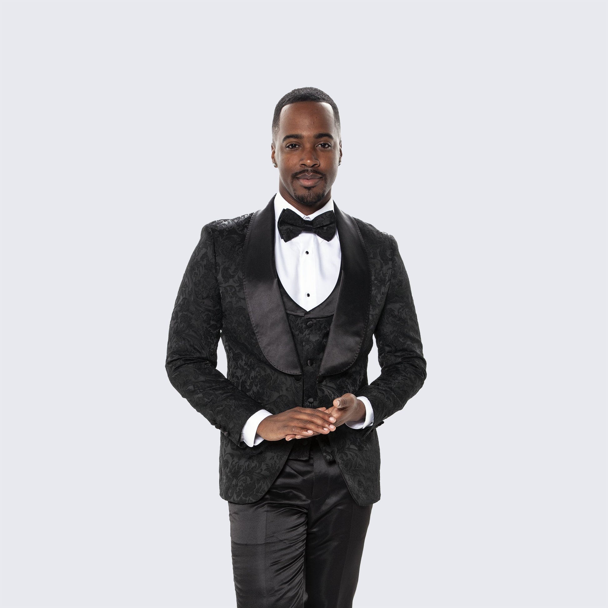 Men's Black Tuxedo with Floral Design Four Piece Set- Wedding - Prom